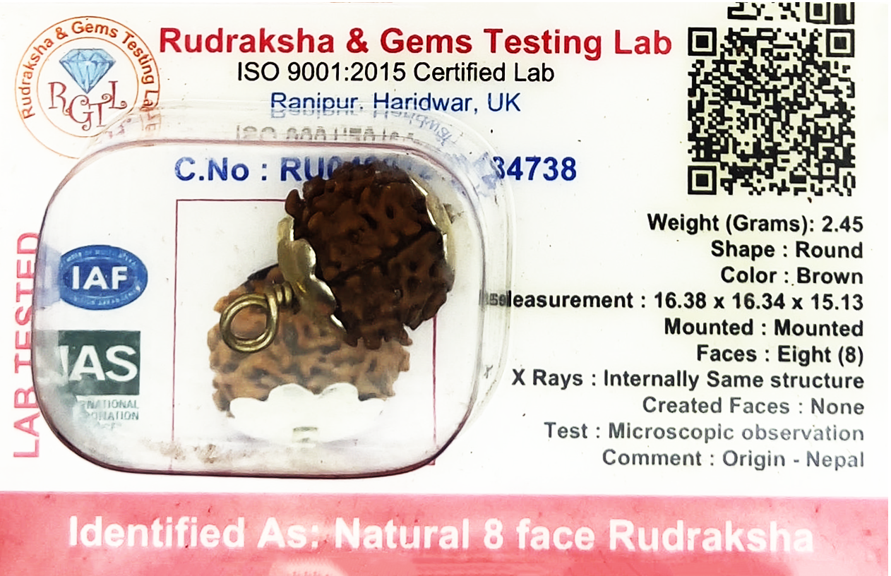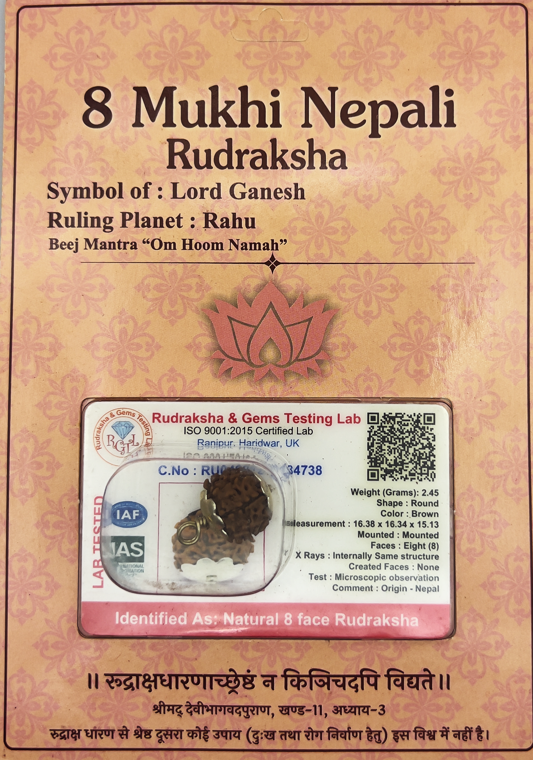 - The 8 Mukhi Rudraksha is certified and lab-tested for authenticity, ensuring that you receive a genuine, powerful spiritual tool.