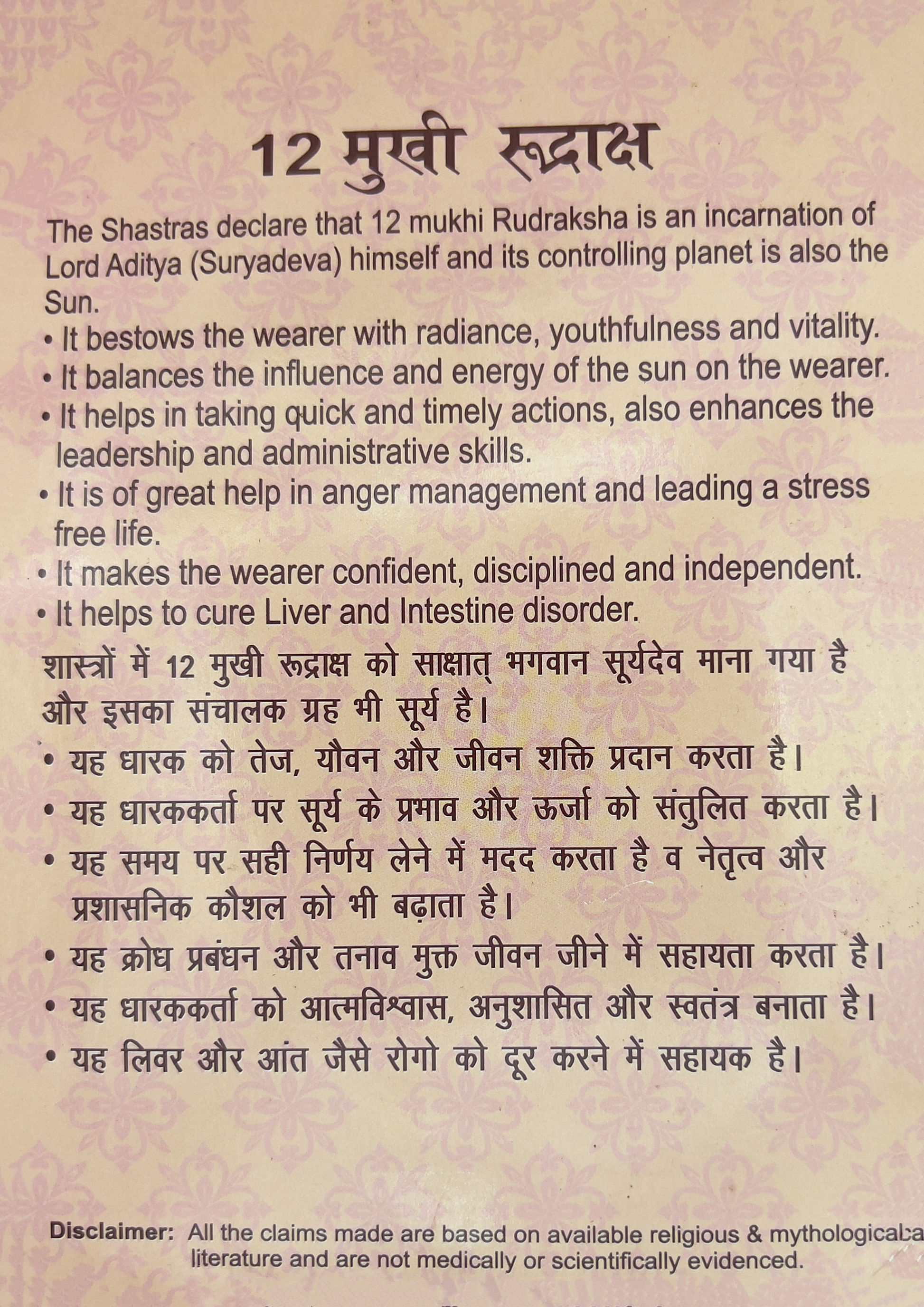 - The 12 Mukhi Rudraksha is certified and lab-tested for authenticity, ensuring you receive a genuine and potent spiritual tool for success and vitality.